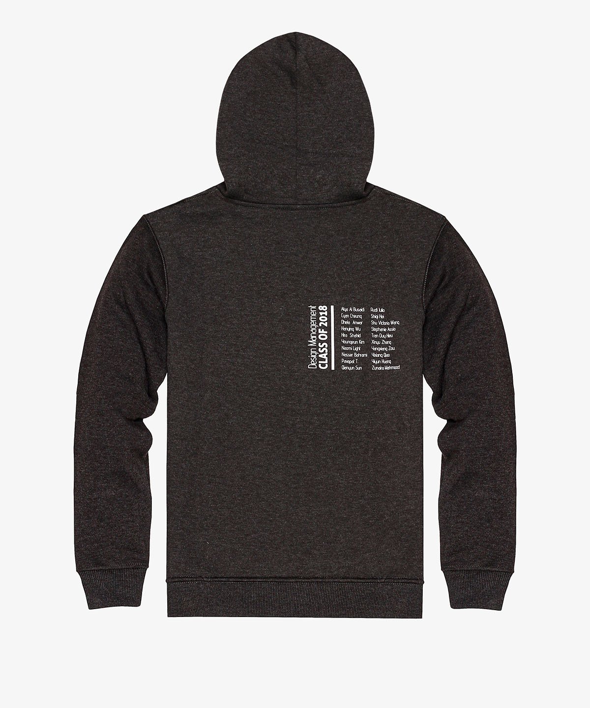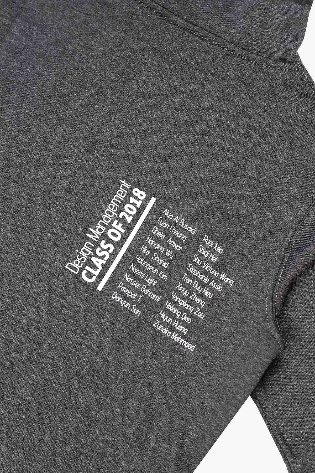 Premium fleece hoodie in women’s cut with hood lining and thick flat cotton rope, manufactured for design management class of 2018. Front chest print in large size and back print on the side.
