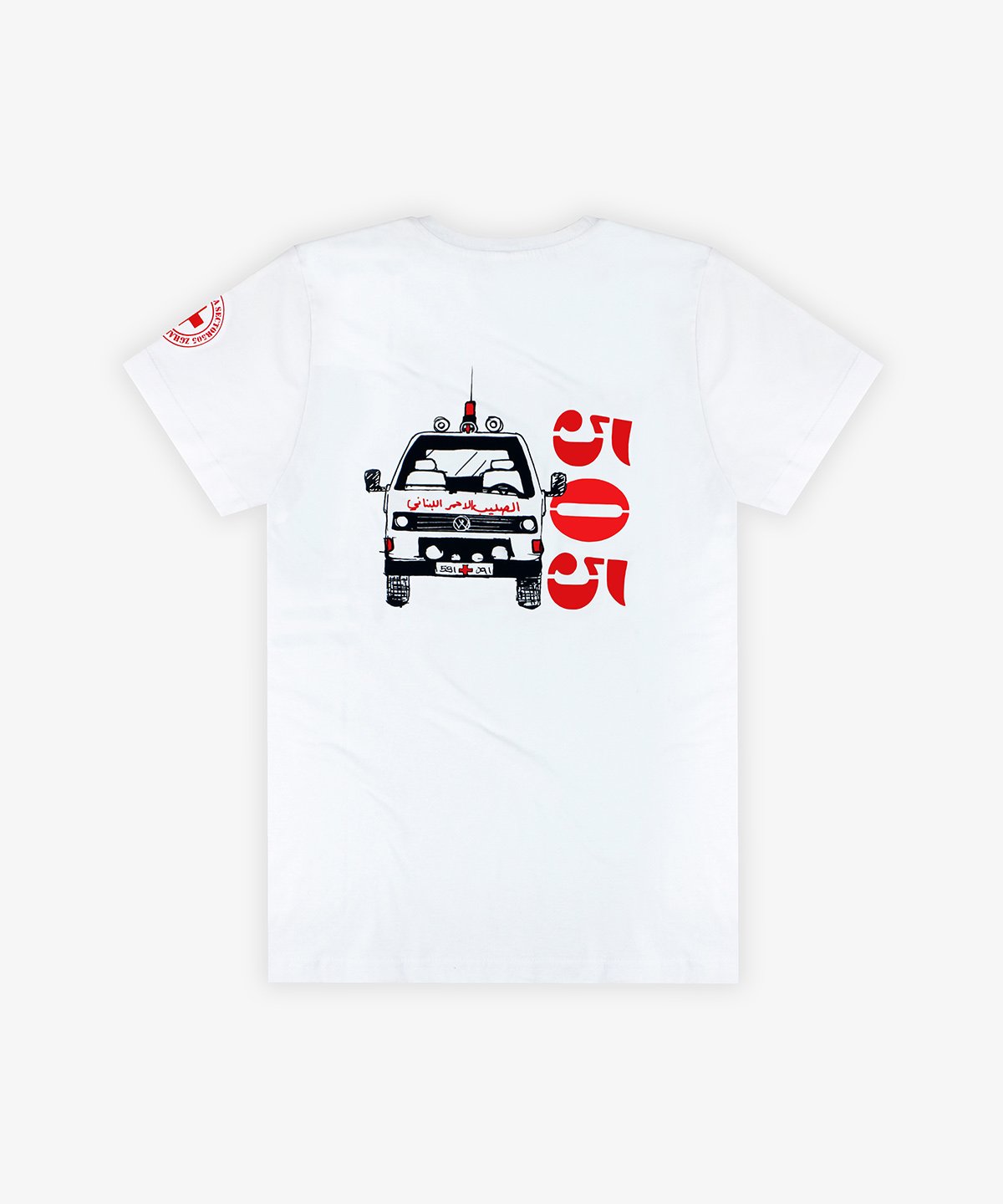 Ready made 100% heavy cotton t-shirt screen printed in 2 colors on front and back and sleeves for the Lebanese Red Cross organization.
